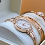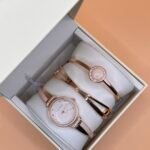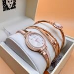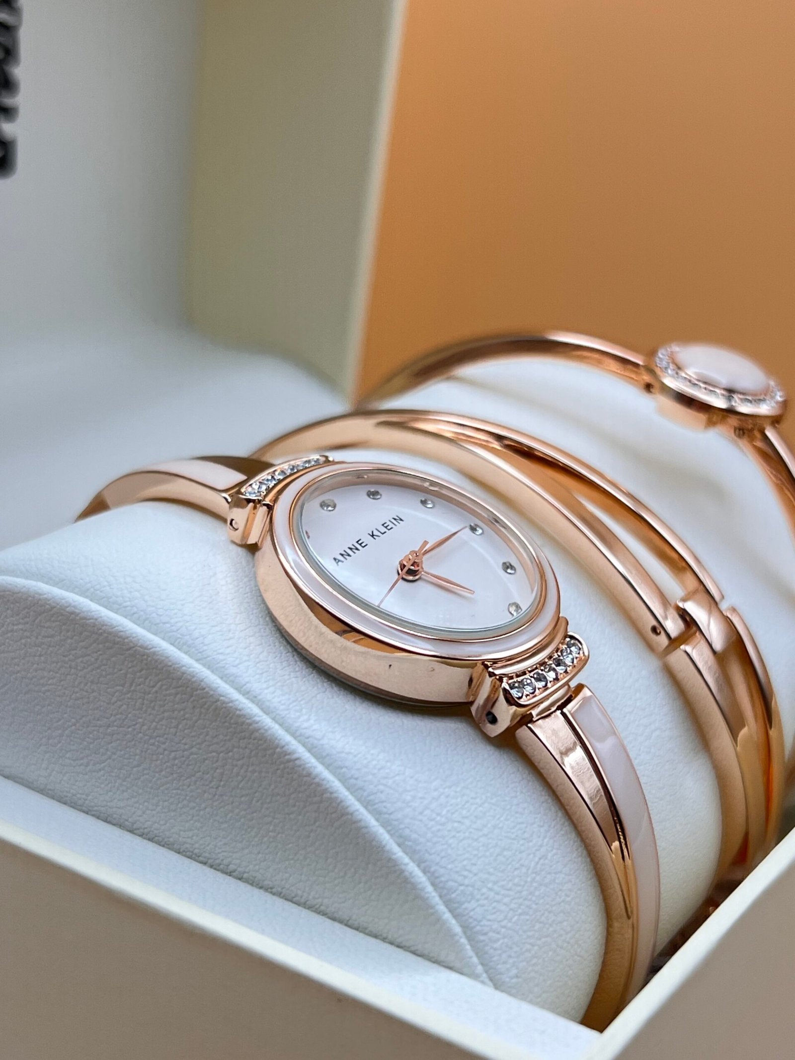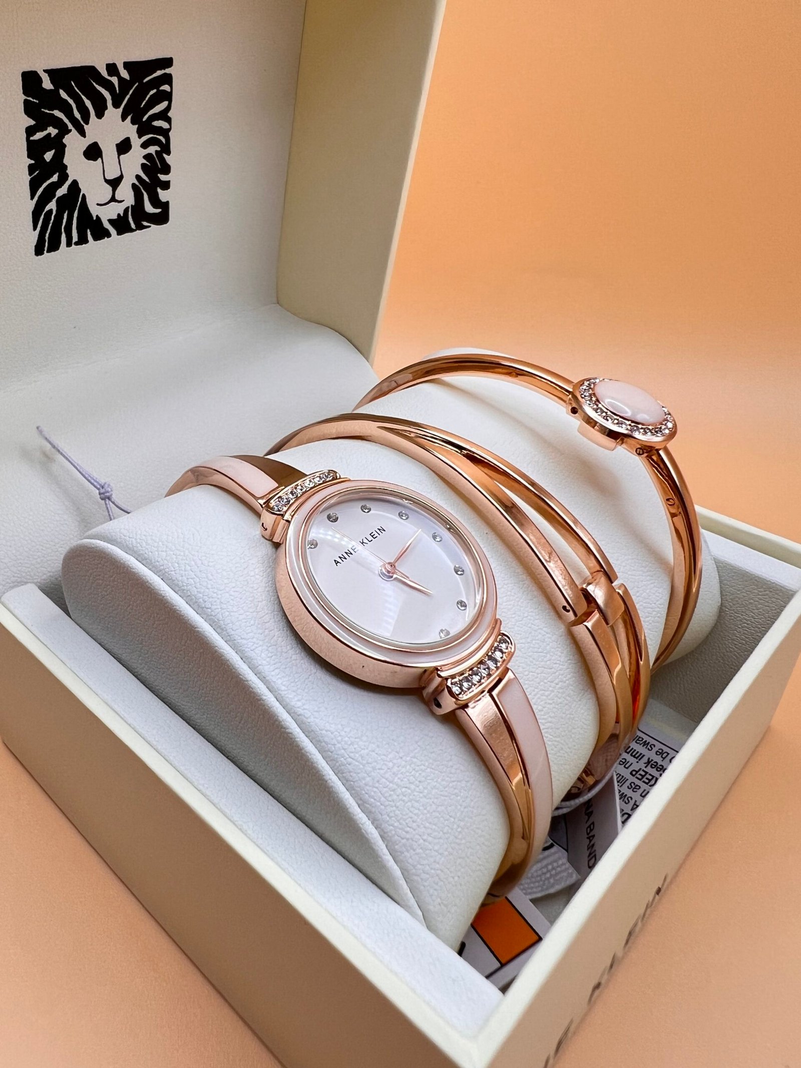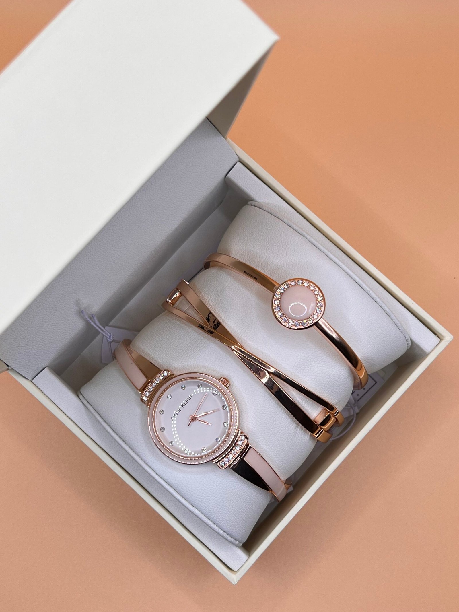 El juego incluye dos brazaletes en tono oro rosa: uno en forma de “X” y uno acentuado con cristales de primera calidad y centro de esmalte rosa rubor